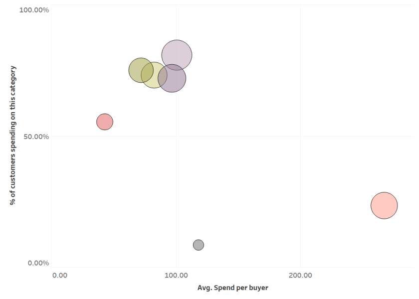 Ultimately you want to be keeping all these metrics in mind when considering your spending categories and your prices. If you wanted to display things in a more visually intuitive manner, you can have a grid that distributes spending categories across spending reach and average spend per buyer.