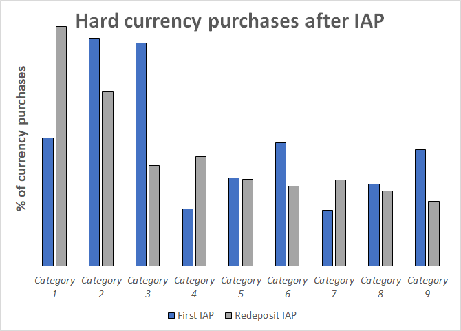 In the example above you see that category 1 and 2 are the main purchases after an IAP. And that doesn’t always match the distribution of all purchases. There are 2 closely related reasons for that. First, players will spend their gems more easily when they have them. Second, most in-game purchases occur at low price points. Lower in-game price point items are the ones that see the most purchases (because they are cheap). But players don’t always make an IAP to then purchase those items in game – they will buy them if they have left-over currency. Those cheap purchases won’t trigger an IAP as often. So, in our example here category 8 is the one that sees the most purchases because it’s a low price point consumable or a low-priced speed up for a timer that occurs frequently in game. But when you look at what players are spending for, then you see it’s not as powerful an IAP trigger as categories 1 or 2.