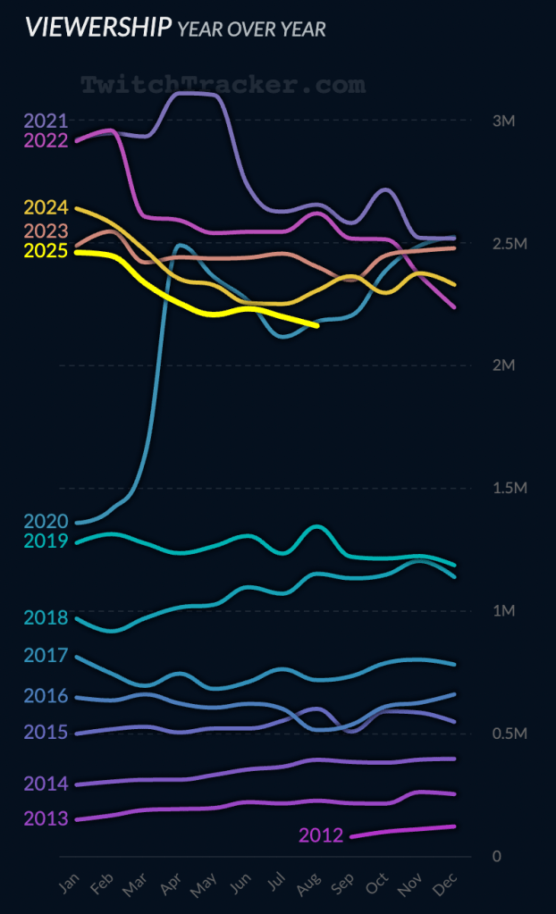 It is difficult to find verifiable and highly reliable data. However, according to Twitch Tracker Total viewership has declined on the platform since the highs of 2021 – but still more than double its pre-pandemic numbers
