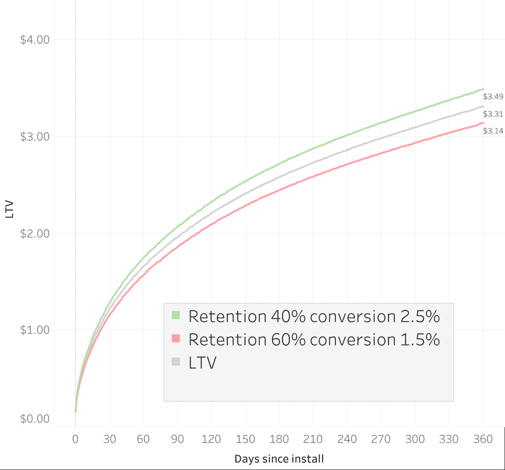 The scenario where you increase d1 retention by 6pp is the one that sees the smallest increase in overall LTV (+13%). Whereas the scenario where conversion increases sees a 29% increase in overall LTV. And I think most of us would agree increasing day 1 conversion from 2% to 2.5% is a challenge – but much less than getting day 1 retention from 49% to 55%