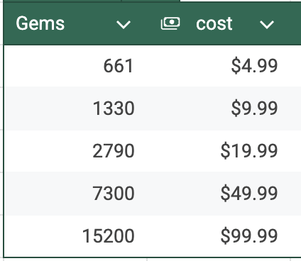 Here you can see that gems become gradually cheaper as players buy higher bundles. The gem price at $9.99 is lower than the basic gem price. Same for the $19.99, $49.99 and $99.99 bundles. So that’s good. Kinda – not sure what’s behind the 0.5% decrease when purchasing the $9.99 bundle vs. the $4.99 one. You’re almost encouraging the player who wants to buy to get the $4.99 bundle.